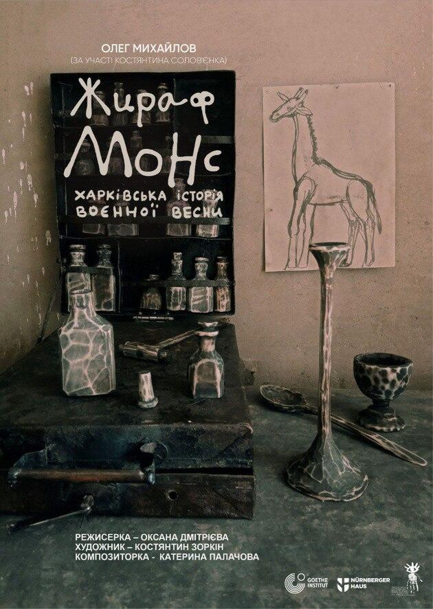 «Жираф Монс» - вистава за казкою Олега Михайлова. В цьому творі в казковій алегоричній формі через досвід війни проходить Жираф, який мешкає у харківському зоопарку в часи Другої світової війни. Відстороненість сюжету від сучасності, притчева природа твору дали можливість створити виставу, яка розкриває болісні теми, але не травмує глядача. Звісно, історія Жирафа Монса – це погляд на війну очима дитини, яка по-своєму сприймає світ, переживає страх та самотність. Але це дуже делікатна розмова, яка адресована і дітям, і дорослим. Про війну, про співчуття та підтримку.